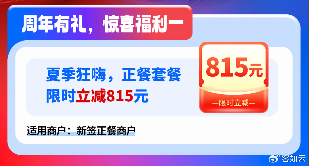 - 周年有禮,驚喜福利一:夏季狂嗨,新簽正餐商戶可享限時套餐折扣;