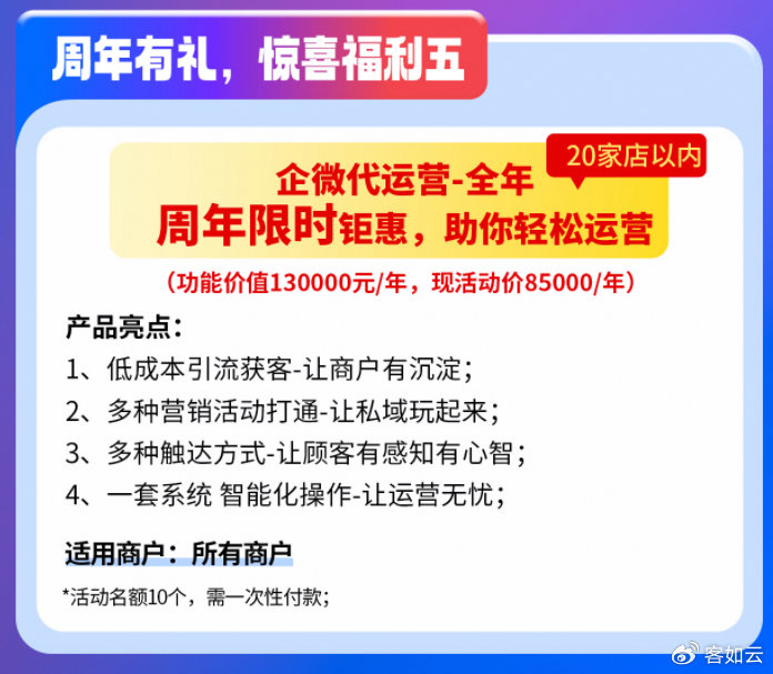 更多客如云13周年優惠活動政策,可關注客如云官方動態及專業產品運營團隊或專屬小二獲取更多普惠信息。